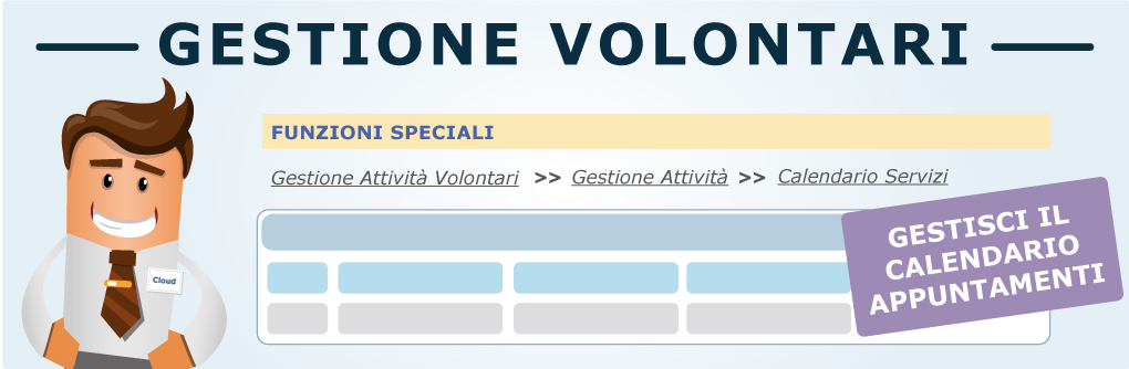 Programmare e gestire le attività dei volontari non è mai stato così semplice! Organizza e monitora le iniziative affidate ai volontari attraverso un calendario dinamico ed intuitivo, collegato con le anagrafiche dei volontari, degli assistiti, dei veicoli e delle varie tipologie di intervento, modificabili in base alle Tue esigenze.