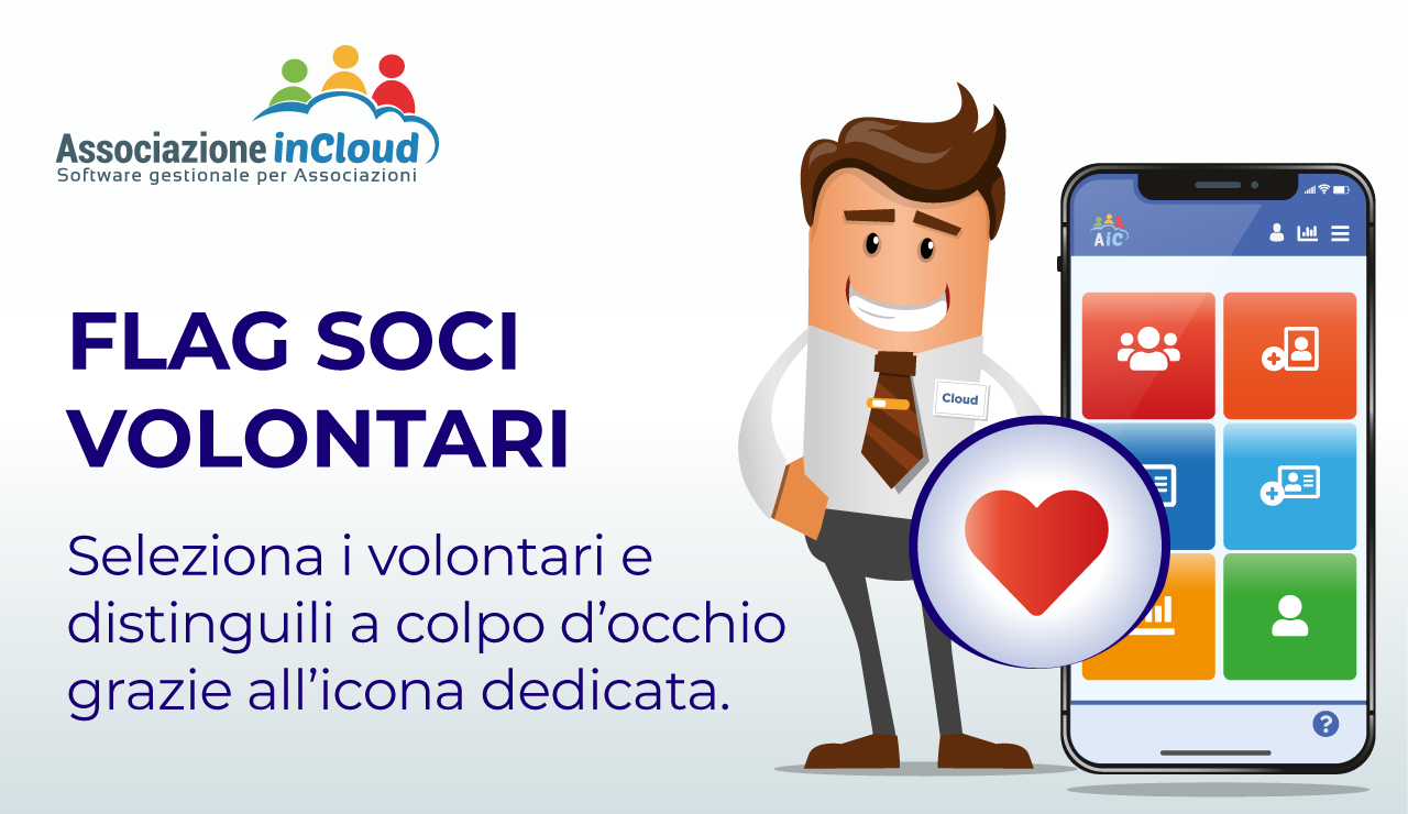 - Novità per AssociazioneInCloud Versione APP: Flag soci volontari 01/06/2021 12:42Con AIC App FREE e AIC App PRO hai l’opportunità di selezionare con un flag i soci volontari e di distinguerli a colpo d’occhio in anagrafica grazie all’icona dedicata. La nuova funzione permette inoltre di ottenere rapidamente l’elenco dei volontari.