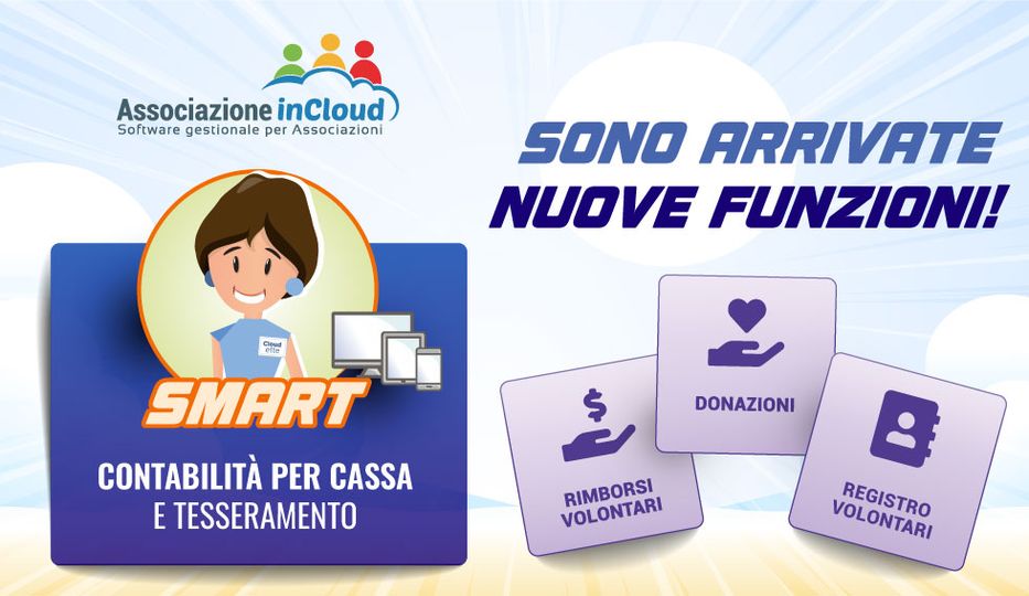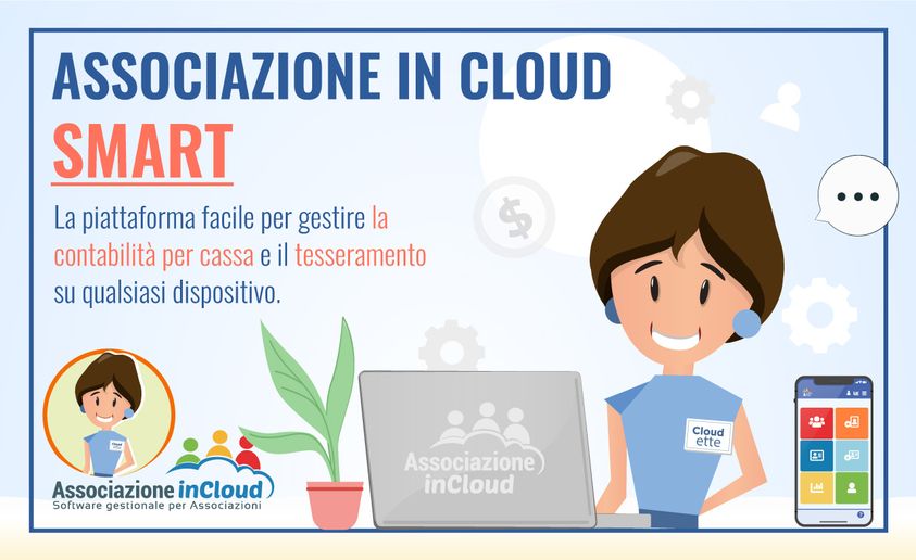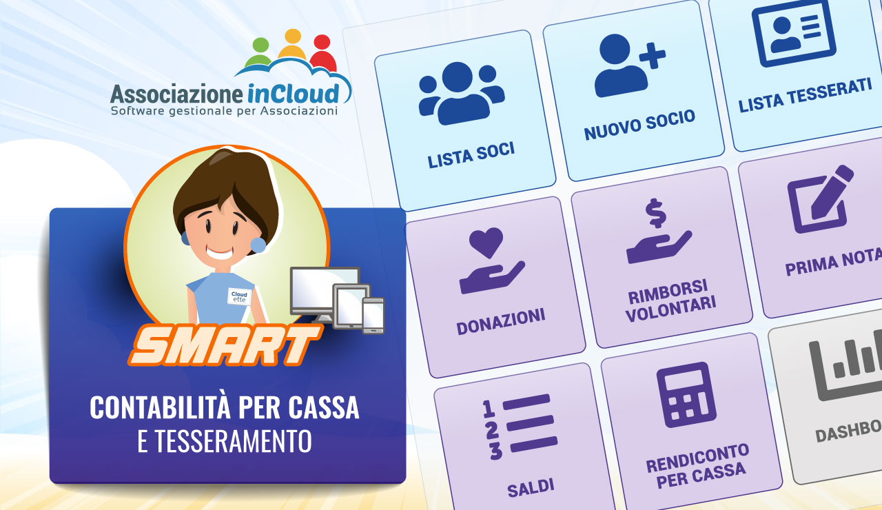 - AssociazioneInCloud SMART 01/01/2018 10:05Sei alla ricerca di una soluzione semplice e veloce per gestire la contabilità per cassa e il tesseramento della tua associazione?Con AssociazioneInCloud SMART puoi: