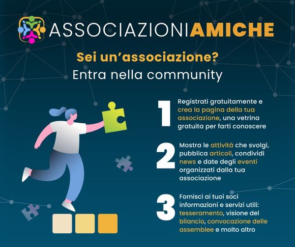 - Associazioni Amiche – La vetrina per le associazioni 24/11/2025 11:36Entra nella nostra community e crea la pagina della tua associazione, una vetrina gratuita per farti conoscere da migliaia di persone interessate alle tue iniziative!Con Associazioniamiche.org, avrai la visibilità che meriti.Mostra le attività che svolgi, pubblica articoli interessanti, condividi news e tieni aggiornati i tuoi followers sulle date degli eventi organizzati dalla tua associazione.Offri ai tuoi soci servizi utili come il tesseramento, la visione del bilancio, la convocazione delle assemblee e tanto altro ancora.